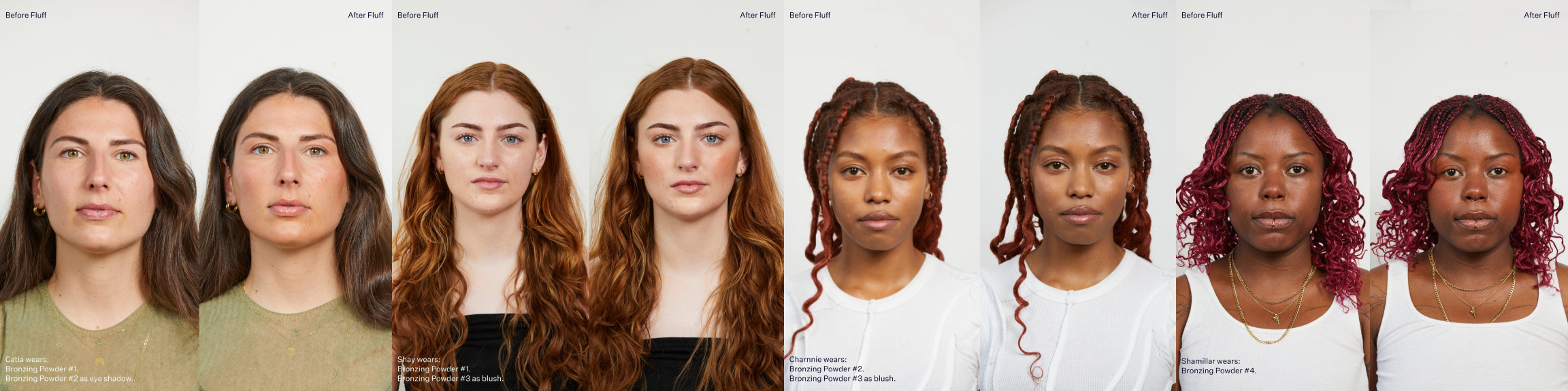 Fluff's Refillable Lip Oil and Bronzing Powders are buildable and designed to be multi-use, our Lip Oil can be applied to the cheeks and eyes as a dewy blush or a glossy eyeshadow.